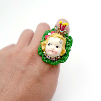 另一款的金髮娃娃還戴上皇冠,戒指底托用上黃銅材質的開口戒指圈,可以調整尺寸十分方便。